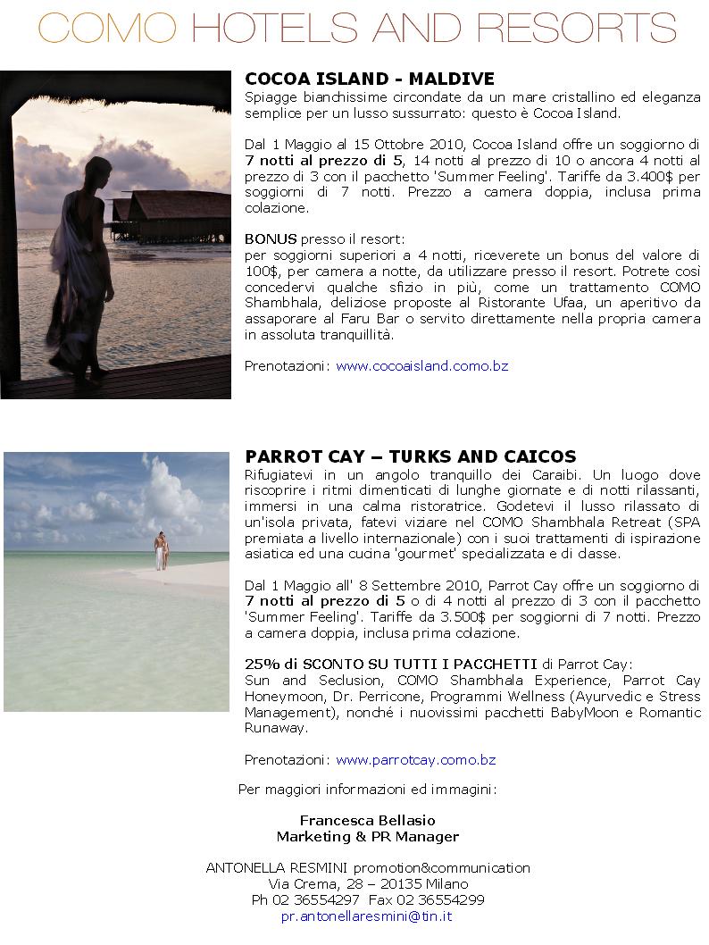 Sun and Seclusion, COMO Shambhala Experience, Parrot Cay Honeymoon, Dr. Perricone, Programmi Wellness (Ayurvedic e Stress Management), nonché i nuovissimi pacchetti BabyMoon e Romantic Runaway.
