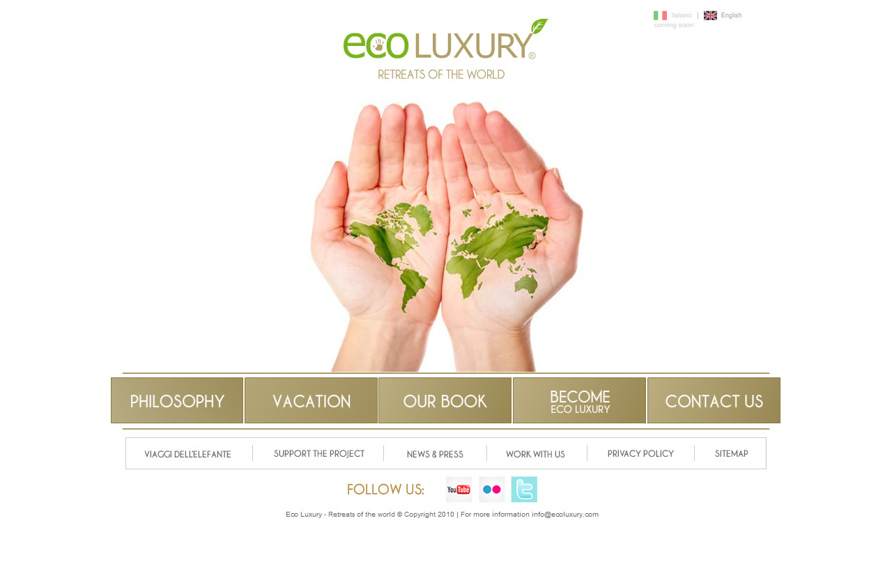 Il rinnovo del sito Eco Luxury parte dal layout e dal design: il bianco, il verde e il color terra caratterizzano il sito che riprende il layout della nuova directory 2010 inserendo in home page il mondo verde contenuto nelle mani: immagine chiaramente evocativa che comunica fortemente la filosofia del business e del turismo responsabile. Anche l'uso delle immagini, di particolare impatto e bellezza, è in linea con le scelte fatte nel layout della directory.