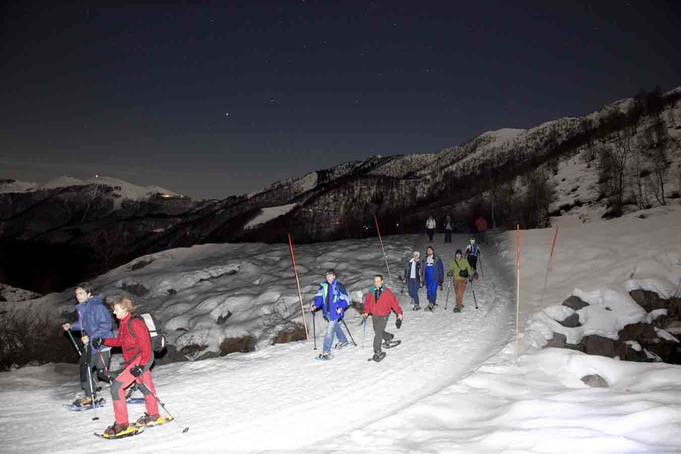 Per gli adulti il ritrovo è alle ore 18:00 sempre presso lo Chalet Bielmonte; la partenza è prevista alle ore 18:30 su un percorso adatto a tutti, anche a chi non ha mai messo le ciaspole. La prima parte è una bella passeggiata dal Piazzale 1 al Piazzale 2 poi si mettono le ciaspole ai piedi e ci si avvia per raggiungere il Monte Marca, meta finale dell'uscita, raggiungendo così il gruppo dei bambini. Durante il tragitto, sempre accompagnati da un esperto del territorio, si potranno ammirare paesaggi e panorami che variamo dalla selvaggia Valsessera alla popolata Pianura Padana illuminata dalle luci dei paesi che si estendono tra Torino e Milano.