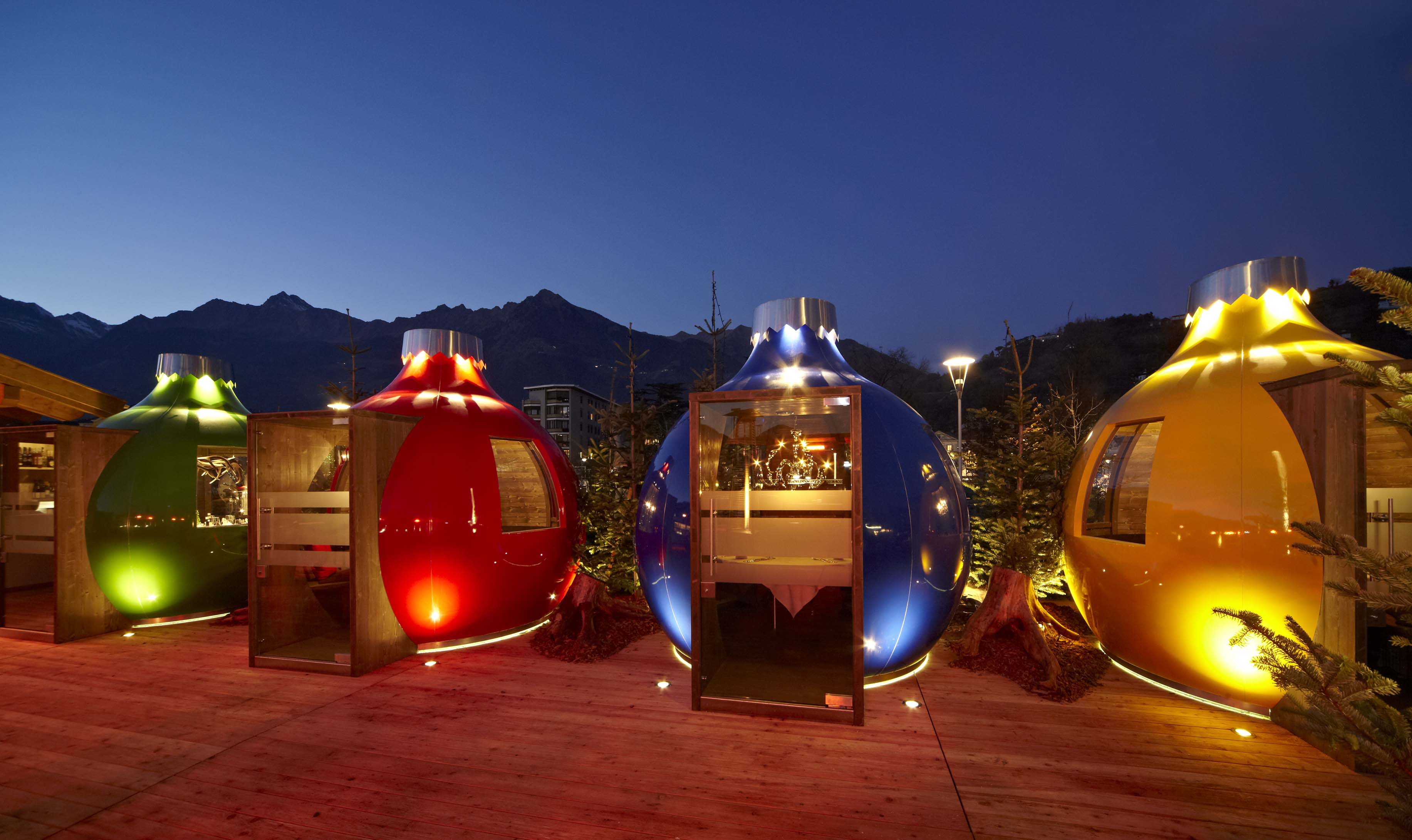 "Palle Presepe": novità del Natale 2012 a Merano. A cena nella sfera natalizia. Strenne alla mela. Un Natale senza angoli, spigoli o punte. Un Natale tutto tondo è quello che si vive alle Terme Merano dal 29 novembre 2012 al 6 gennaio 2013. Un Natale spontaneo e genuino, ironico come le originali "Palle Presepe", novità 2012, invitante come le sei sfere colorate che fungono da punti di ristoro in piazza Terme, suggestivo come i cerchi sospesi sulle piscine della sala bagnanti, buono come le mele della linea cosmetica delle Terme Merano.